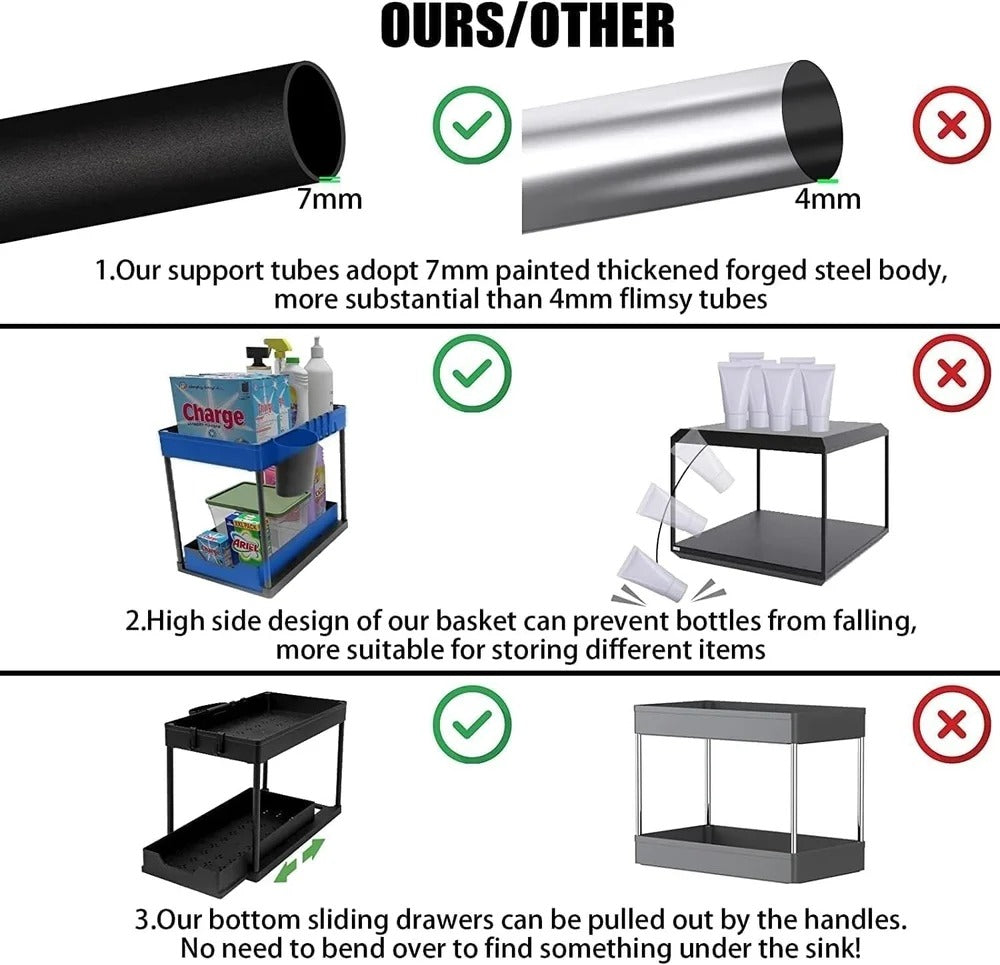Maximize your under-sink or countertop storage with this 2-Tier Bathroom Cabinet Organizer, featuring a smart pull-out drawer design with double sliding baskets. Designed to fit neatly under bathroom or kitchen sinks, this organizer makes cluttered spaces clean, accessible, and efficient.